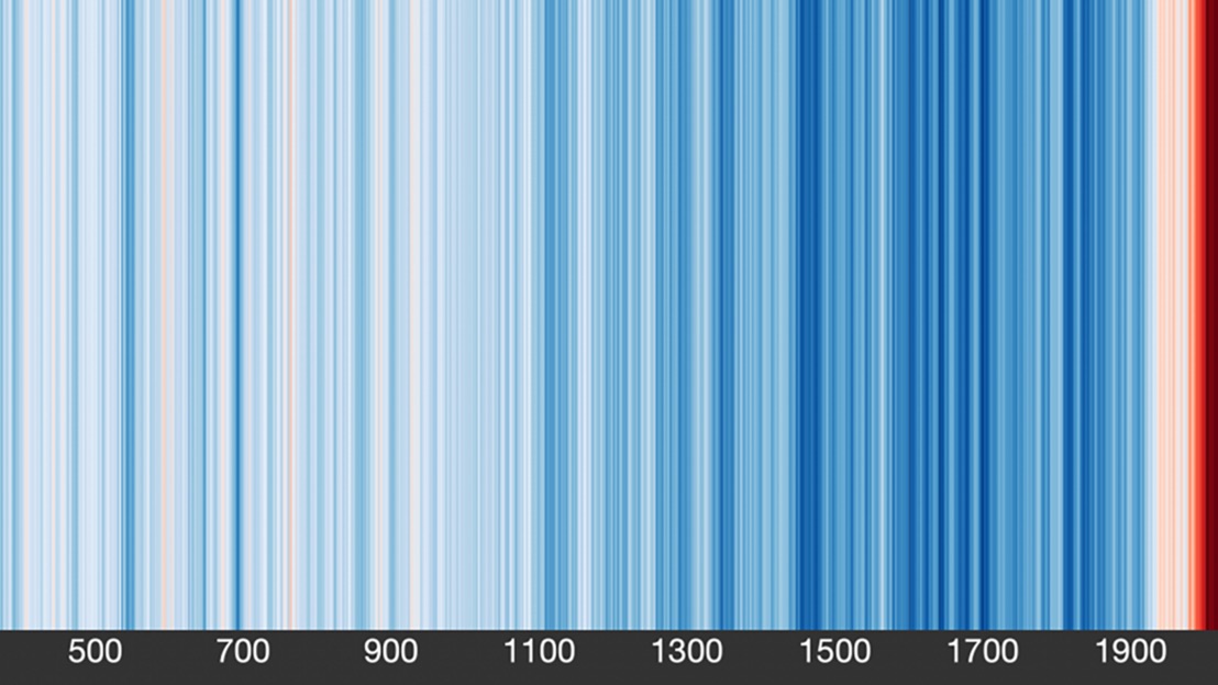Das Kopfbild mit dem Namen “Klimastreifen“, das ein sind Datenvisualisierungsgrafiken, die eine Reihe von farbigen Streifen in chronologischer Reihenfolge verwenden, um langfristige Temperaturtrends visuell darzustellen.