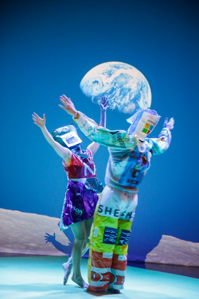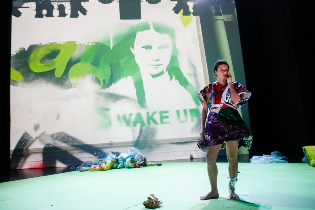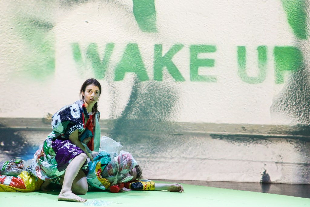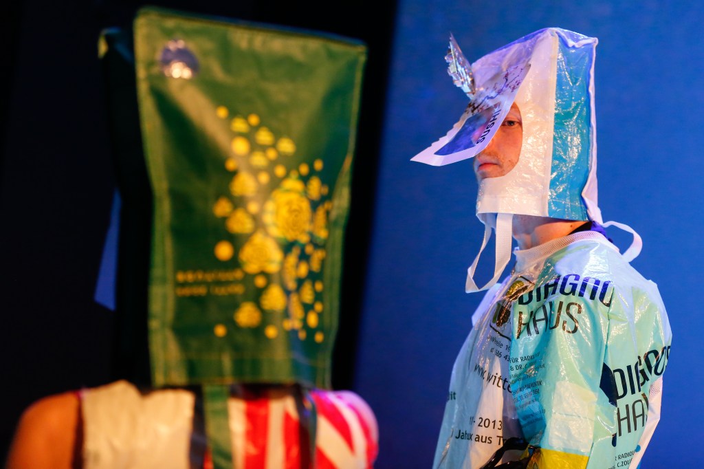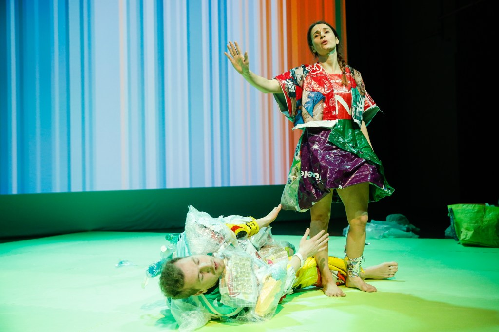In der mit visuellen Elementen ausgeschmückten Produktion performen die Italienerin Elda Gallo und der polnische Lukasz Czapski. In Kostümen aus Einkaufstaschen und Plastiksackerln führen sie uns den globalen Überkonsum vor Augen.